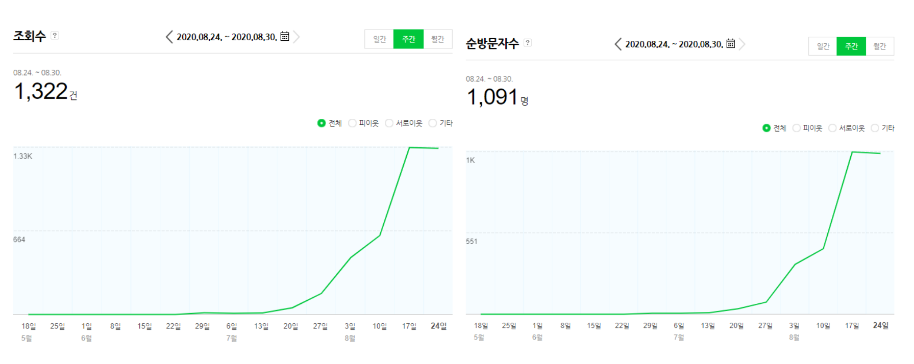 이게 제 블로그입니다. 7월 4일 계정 만들고 첫 글, 이후 60일간 쌓인 글이 36개. 주 단위 방문자 수는 첫 주부터 7, 7, 10, 37, 82, 338, 445, 1100, 1091… 누적 아니고 주간입니다. 증가세가 괜찮나요? 원래 이렇게 돼야 정상입니다. 마지막 주에는 새 글을 하나도 안 썼고요.